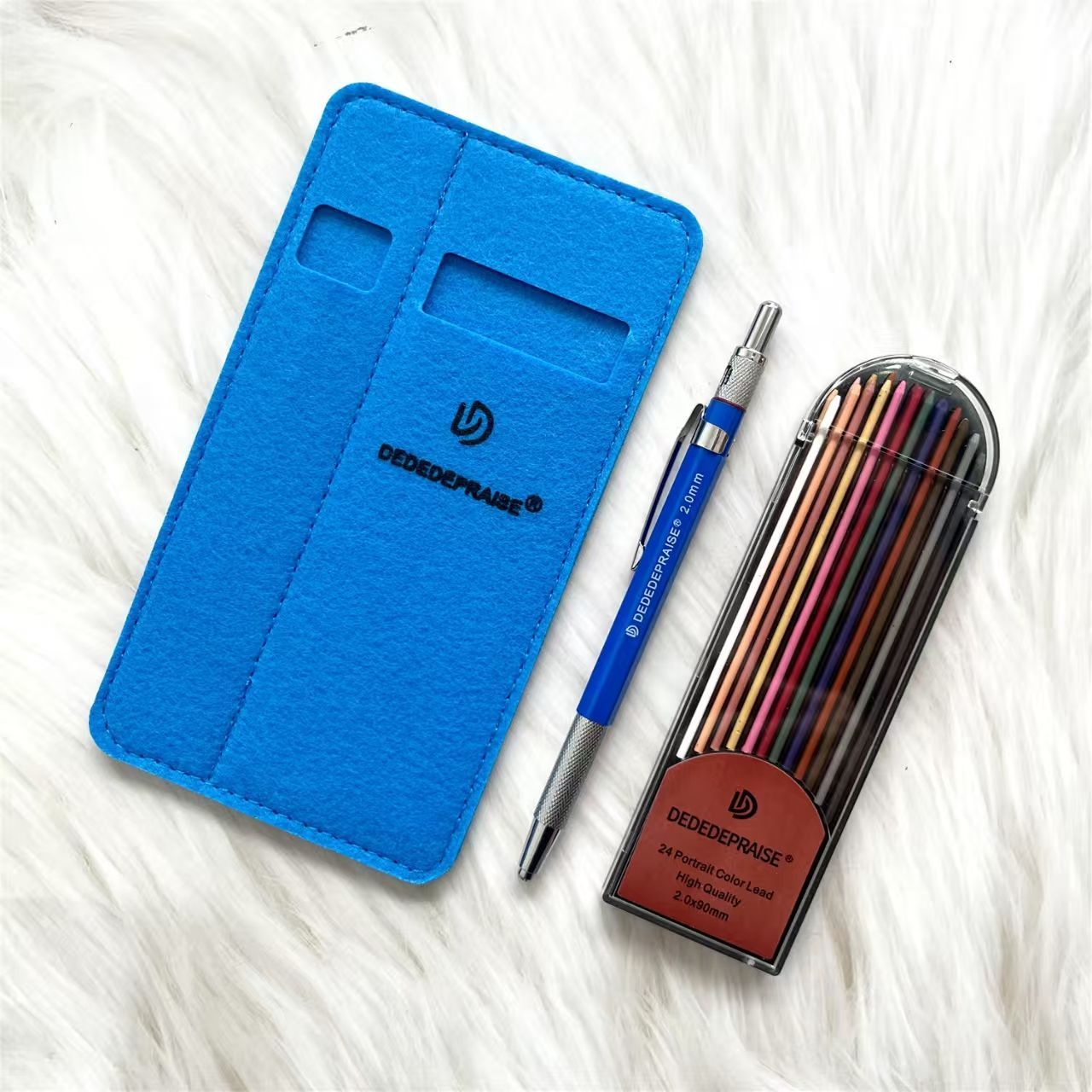 This premium set is perfectly paired with a durable, metal-clip automatic pencil. The pencil features a comfortable grip and a reliable push-button mechanism for precise lead advancement and control. Everything is neatly organized and protected in a stylish, navy-blue felt pouch with a dedicated slot for the pencil and a clear-view compartment for the 24 individual lead tubes. The iconic DEDEDEPRAISE® branding marks a commitment to quality.