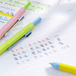 Instructions for using the multi-color pen: First, you need to select the color you want to write, then turn the side of the pen case marked with the color you want upwards, tilt the barrel back 45°, then press the refill of the desired color, if you want to retract the refill, just press the button on the side.