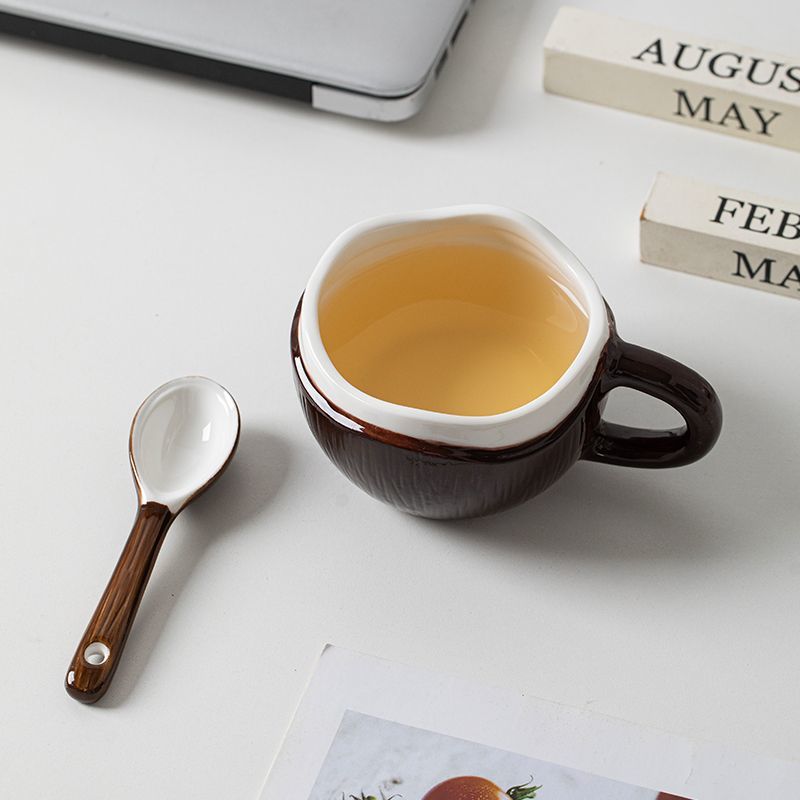 Meet your new favorite mug, inspired by the serene beauty of a tropical coconut. Our Creative Coconut Mug is more than just a cup; it's a delightful conversation starter and a cozy companion for your daily rituals. Expertly crafted from high-quality ceramic, this mug features a stunning dual-tone design. The exterior boasts a rich, glossy brown underglaze finish with textured vertical lines that mimic the authentic feel of a real coconut shell. The interior and rim are finished in a smooth, pure white, representing the fresh coconut meat within.