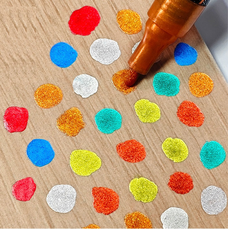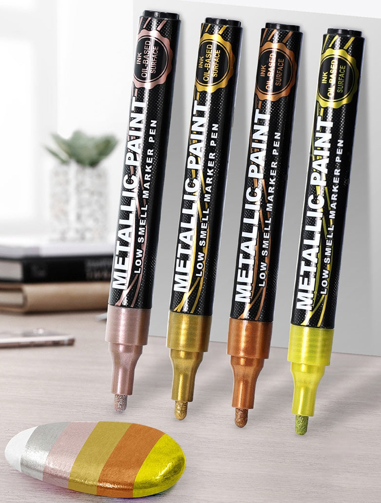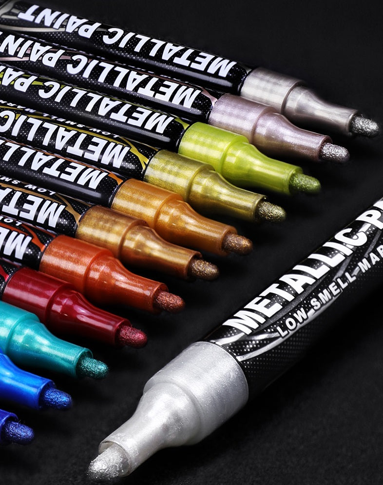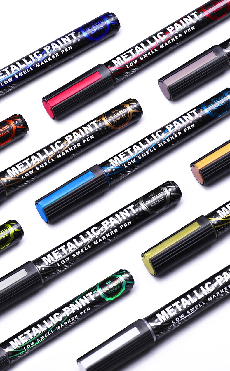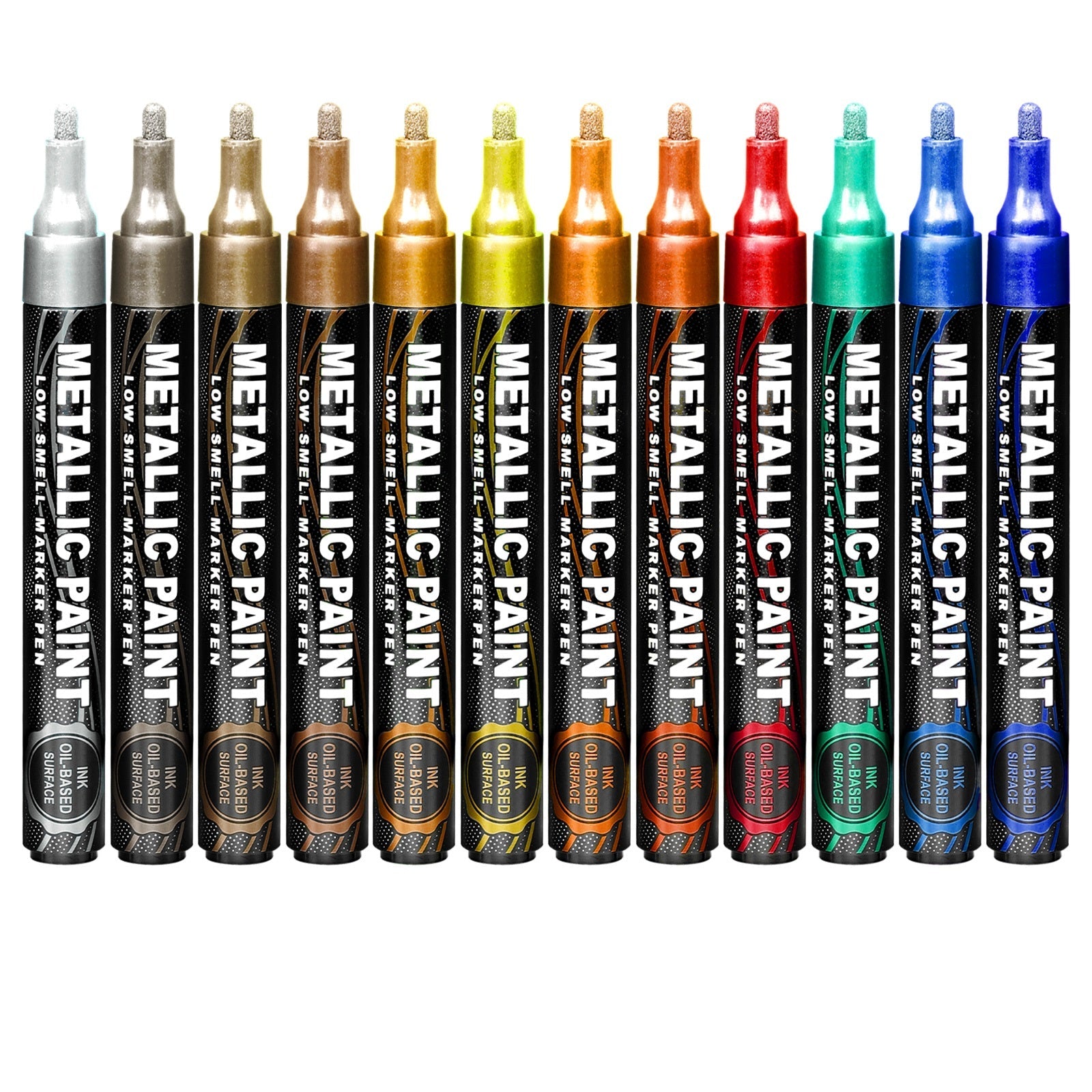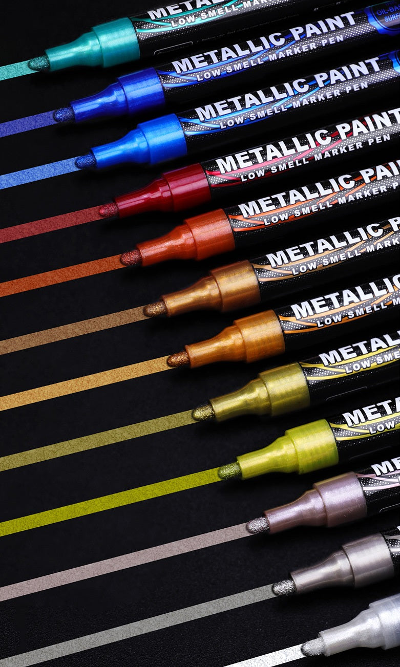 ✔ 12-Color Metallic Paint Marker Set – Includes a vibrant selection of metallic shades (e.g., gold, silver, copper, bronze, and more — exact colors may vary), perfect for decorative art, signage, metal detailing, and more.