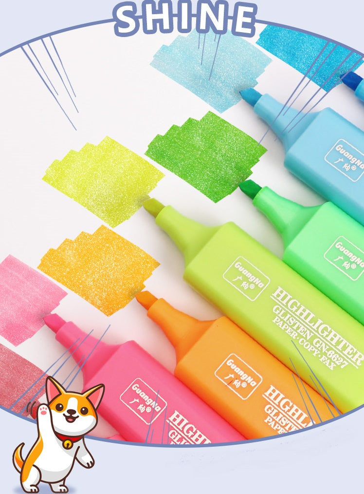 Guangna glitter highlighters come in an 8-pack, providing a range of vibrant colors with a touch of sparkle to enhance your notes and projects.