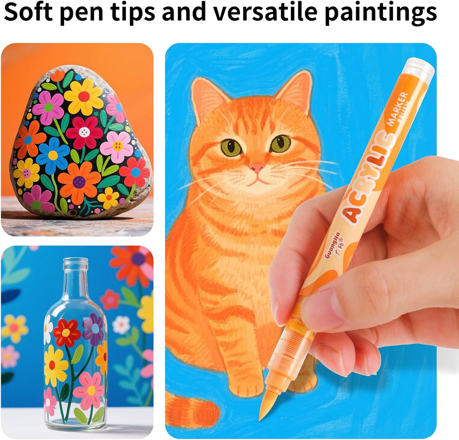Guangna 8201E Macaron Art Markers,12 Color Soft Brush Tip Acrylic Paint Pens, Quick-Drying Waterproof Acrylic Paint Markers for Illustration Sketching, Wood,Glass,Fabric,Rocks Painting