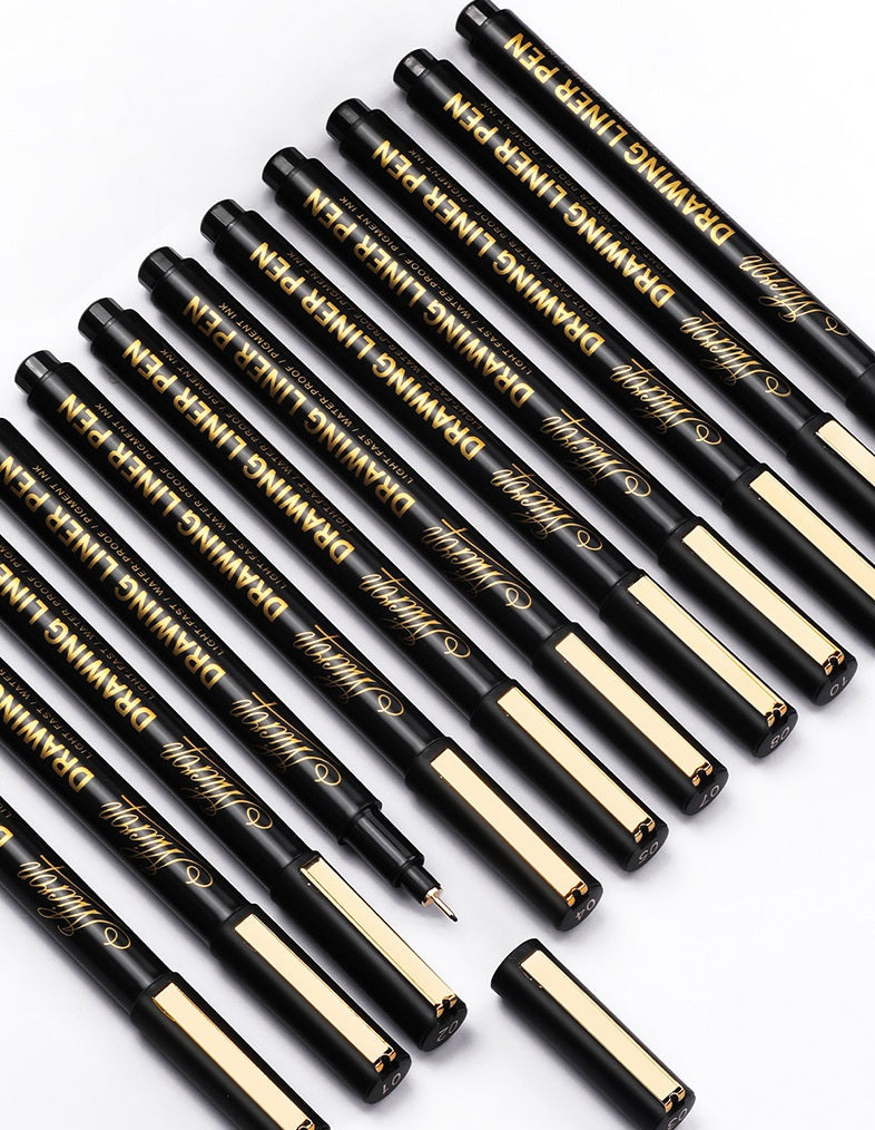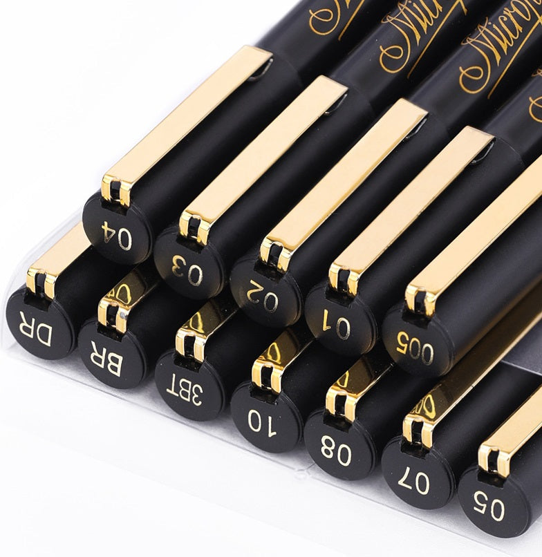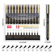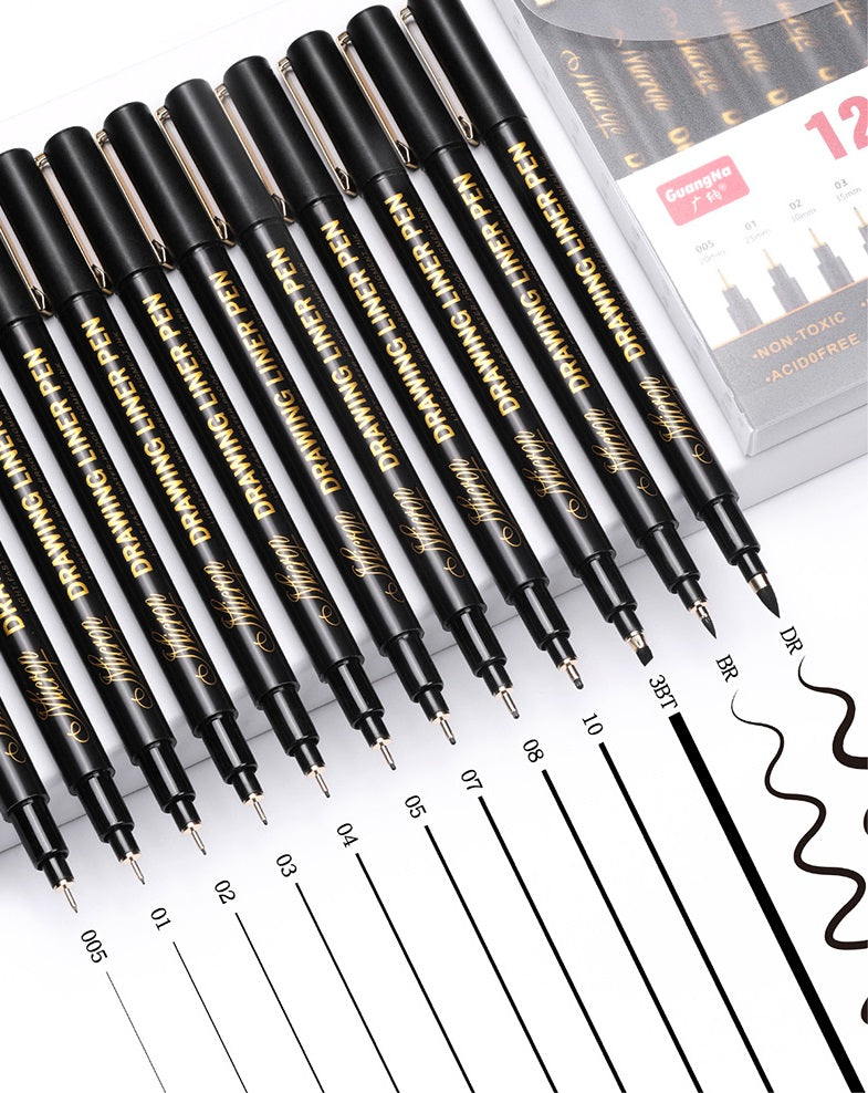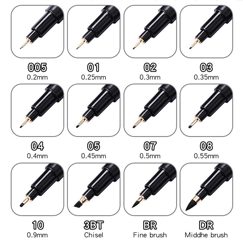 12 Black Drawing Pens: The professional micro pen kit contains assorted types of pen tips from 0.15mm to 3.0mm, plus a brush tip. No Bleed, No Smear and Waterproof. Perfect for drawing and writing. One set of pens for all your art creation needs. Whether you are an artist or a beginner, you can easily use it. Line Width & Cap Size: 0.15mm (003) 0.2mm (005), 0.25mm (01), 0.3mm (02), 0.35mm (03), 0.4mm(04), 0.45mm (05), 0.5mm (07), 0.55mm (08),0.9mm (1.0), 3BT (Chisel), Brush (BR),Middle Brush(DR)