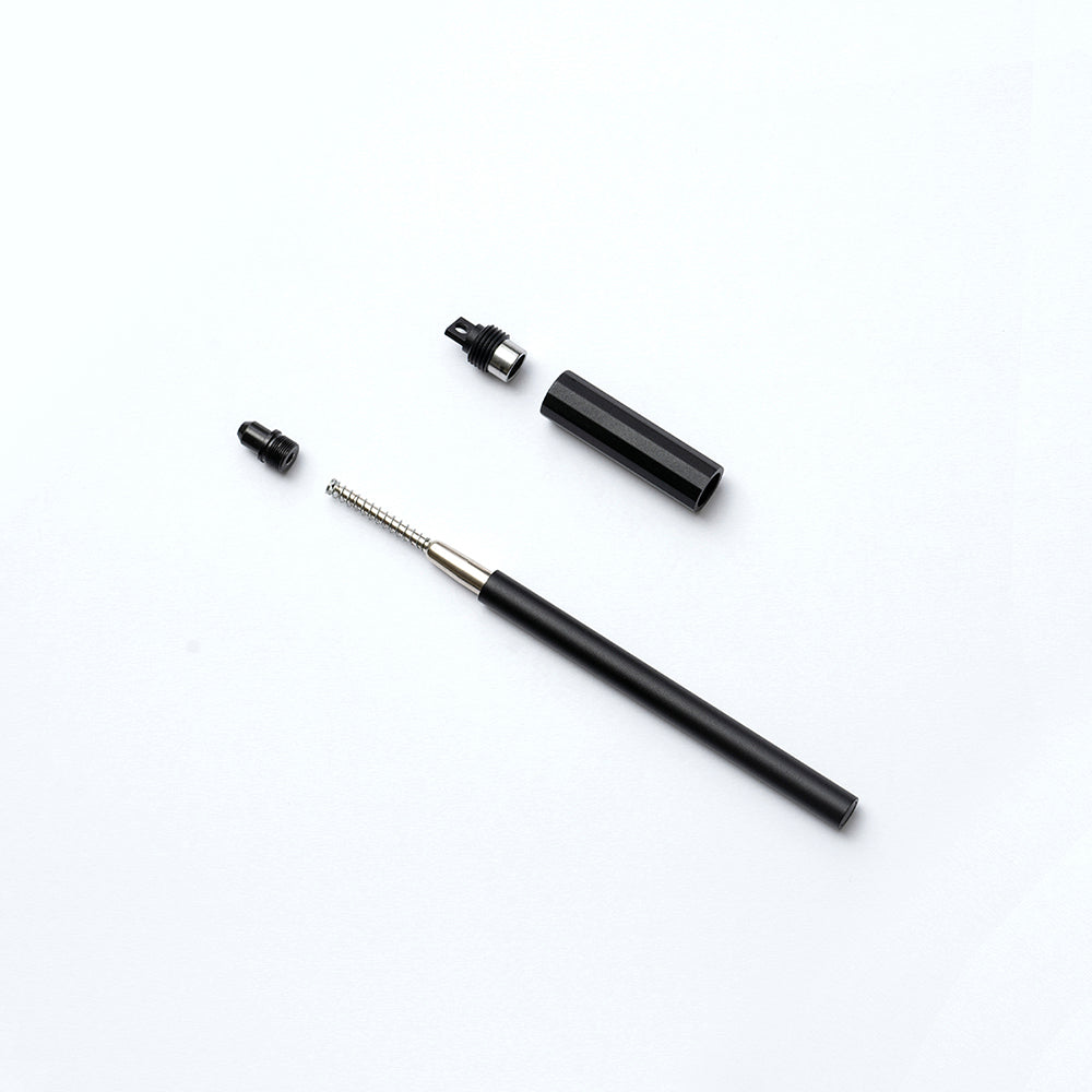 The anodized matte black surface is subtle and mysterious, giving the common daily item an unique style that stands out. The pen features a replaceable German-made SCHMIDT Refill P900M, compatible with Parker-style refills.