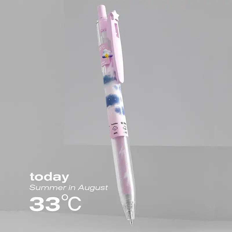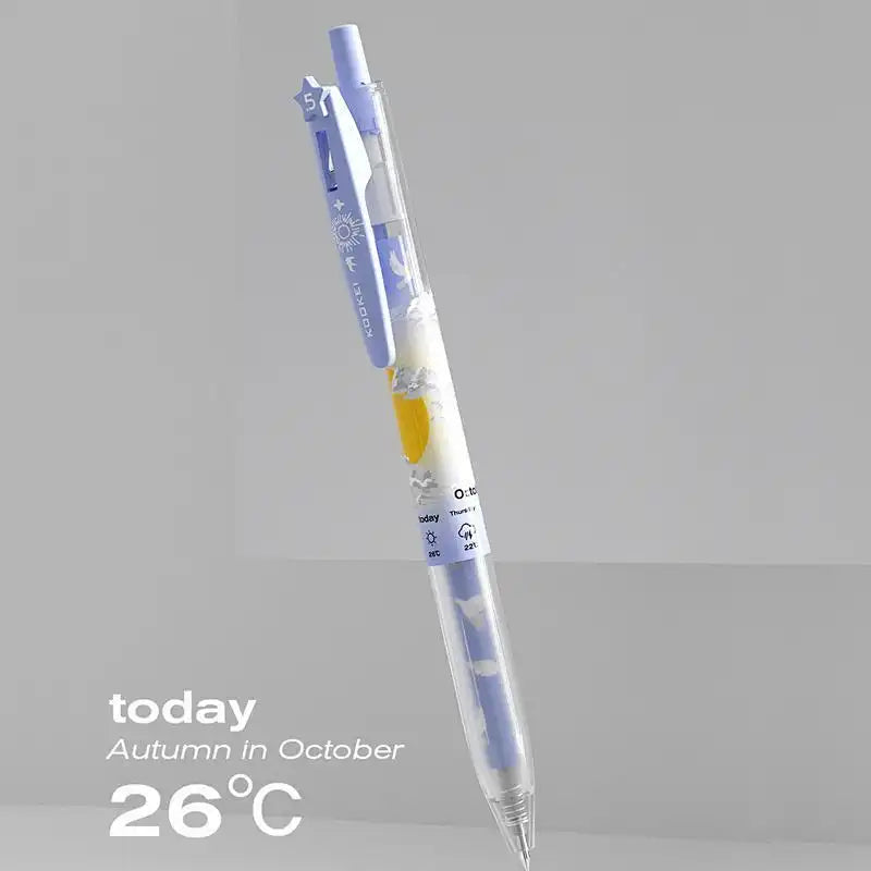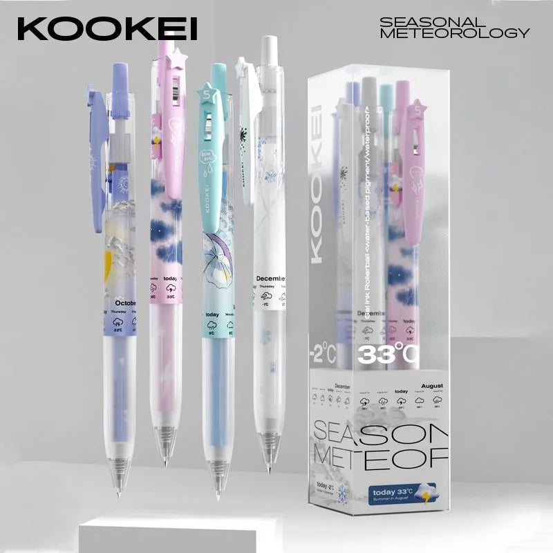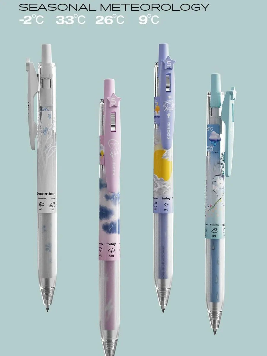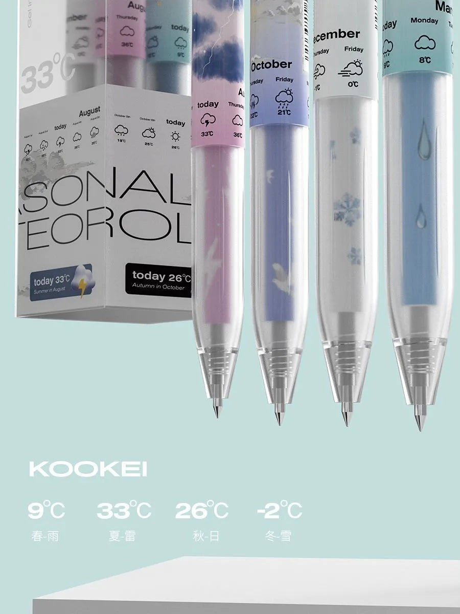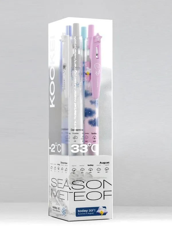 Embrace the ephemeral beauty of the seasons with the KOOKEI Seasonal Meteorology Limited Edition Neutral Pen—a collectible writing instrument that transforms your stationery into a canvas of weather and wonder. Designed for students, stationery enthusiasts, and collectors, this 0.5mm gel pen features four distinct designs—Spring Rain, Summer Thunder, Autumn Sun, and Winter Snow—each capturing the mood of its season with delicate illustrations (umbrellas, lightning, sunbeams, snowflakes) and soft pastel accents. The transparent barrel showcases the seasonal artwork, making it a visual delight for journaling, exams, or daily notes.