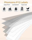 Phomemo Label Tape : 1/2 inch (12mm) each; Length: 13 feet (4m) each. Color: Black on Clear; Package includes: 3-Pack refills plastic label tape.