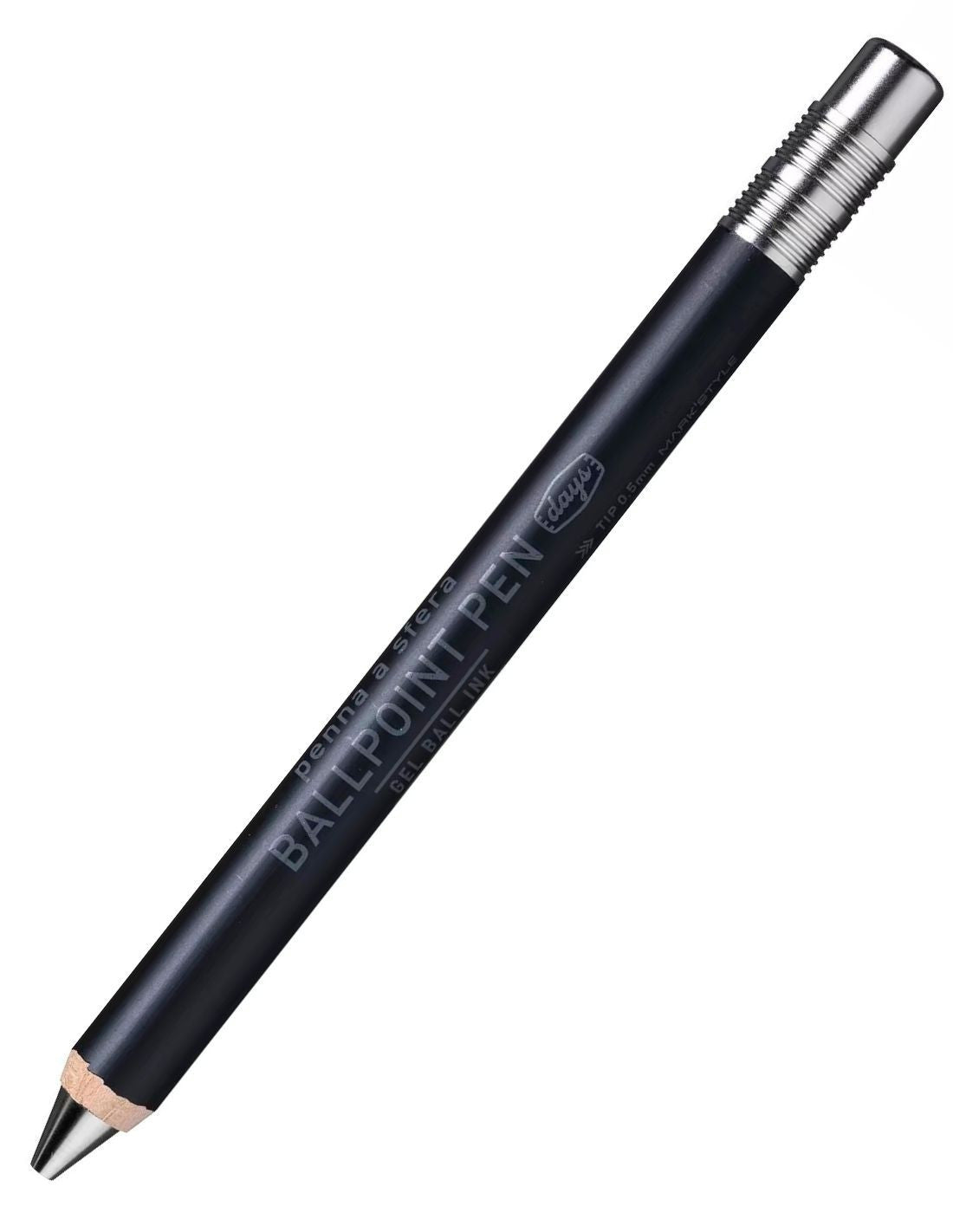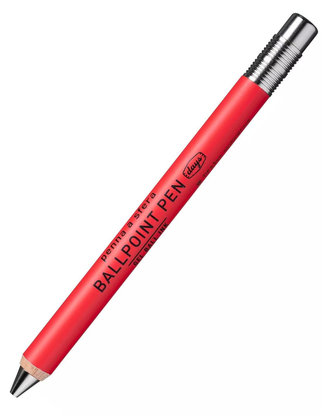 This vintage style retractable ballpoint pen features a round wooden barrel with a fine 0.5mm needlepoint tip, and the quick-dry gel ink is refillable. The printed words "penna a sfera" means ballpoint pen in Italian.