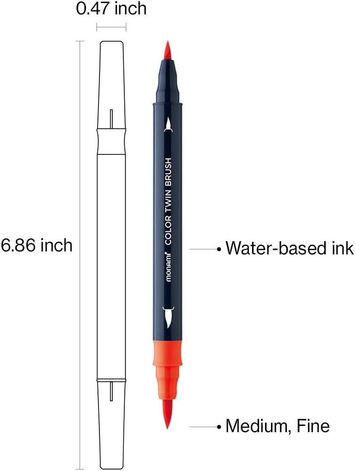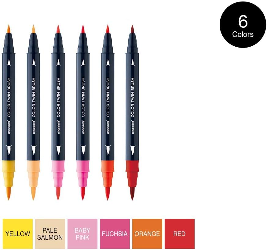 MONAMI Color Twin Brush Dual Brush Pen Double Tipped Fine & Medium Marker for Coloring Book/Calligraphy/Lettering/Illustrations, Flower 6-Pack (Yellow,Pale Orange,Baby Pink,Pink,Orange,Red)