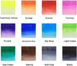 12 vibrant colours: Cadmium Yellow, Orange, Scarlet, Fuchsia, Purple, Ultramarine Blue, Sky Blue, Light Green, Sap Green, Sienna, Mid Grey, Black