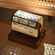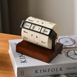 This calendar features a sturdy, richly finished dark wood base that provides a stable foundation and a warm, organic contrast to the crisp, cream-colored rolling drums. The drums are encased in a sleek, matte black metal frame, creating a striking visual balance that complements any decor, from Scandinavian to Industrial.