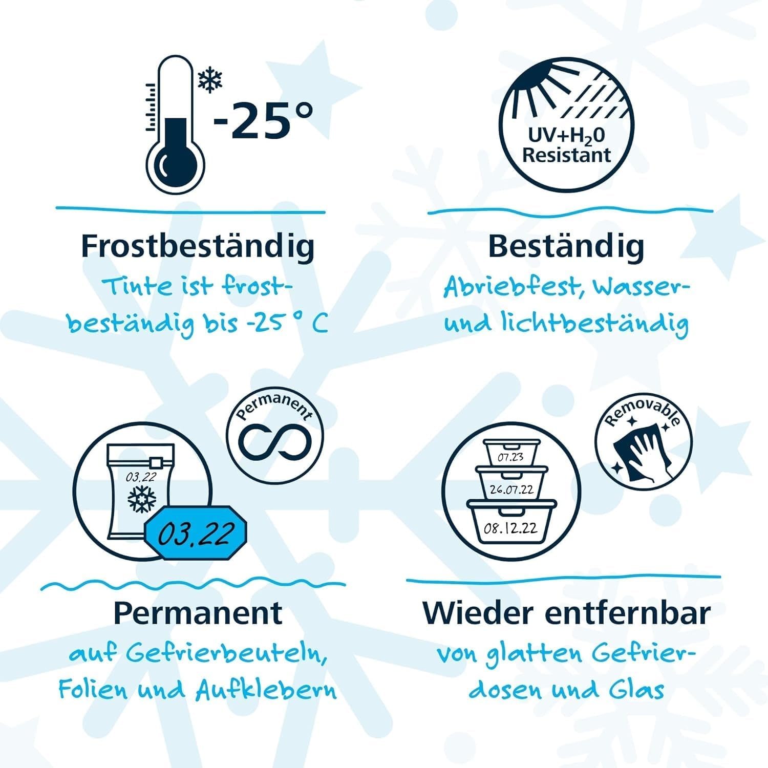 · Permanent on freezer bags, foils and stickers, removable from smooth freezer tins and glass