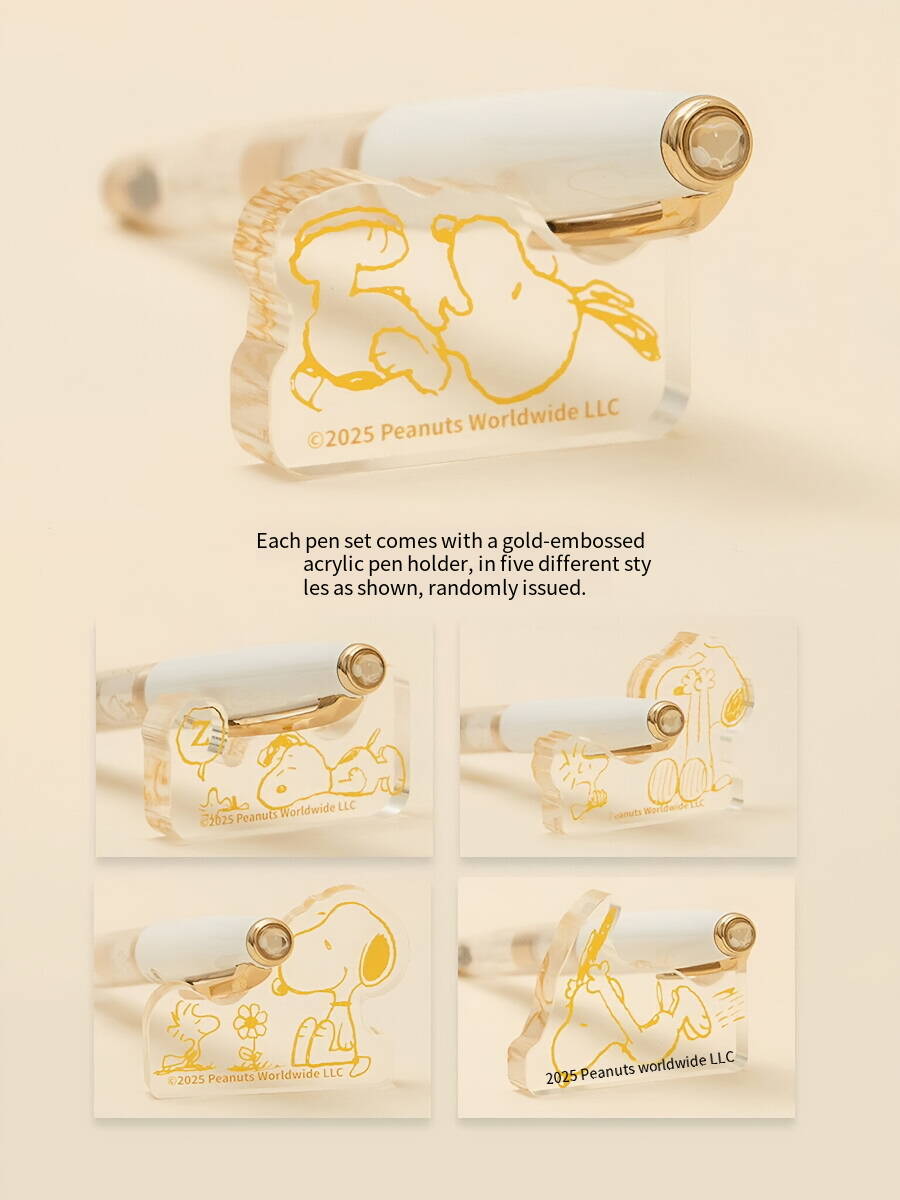 Each set includes a random gold-embossed acrylic pen holder (5 adorable Snoopy styles: lounging, guitar-playing, with Woodstock…), making it a chic desk decor piece! Plus, bonus ink and a warranty card – thoughtful details that wow.