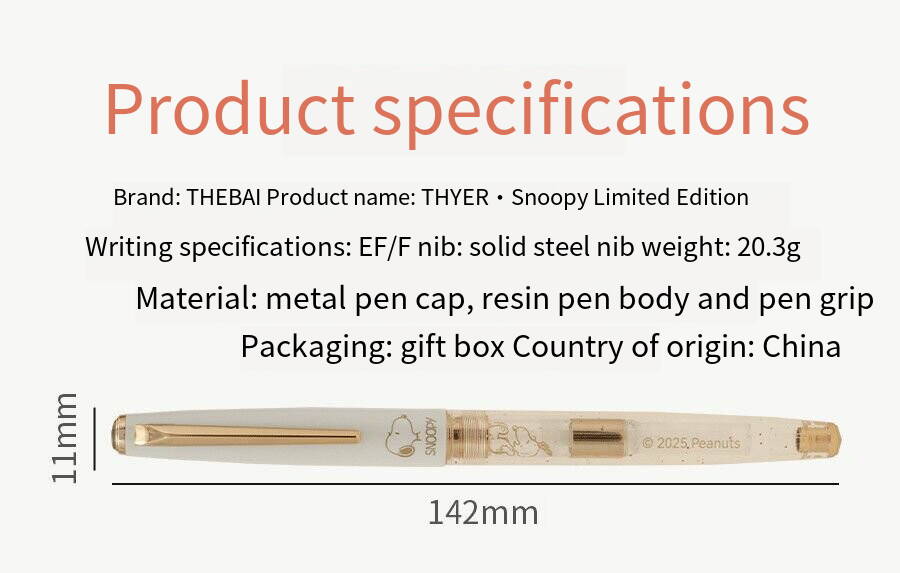 The pen boasts a soft milk-white body with gold accents, and a semi-transparent barrel revealing adorable Snoopy prints. Unbox it and you’ll fall in love with the leather-style gift box, featuring cute Snoopy and Woodstock illustrations inside – pure healing vibes!