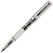 Clear 'demonstrator' barrel reveals the filling mechanism, a built-in piston-filler with a very smooth action. Chromed metal trim and pocket clip. TWSBI logo nicely finishes the top of the pen's cap. Rubber o-ring on cap thread ensures an airtight seal to prevent ink drying out in the pen, whilst also ensuring that the cap is firmly attached to the pen when not in use.