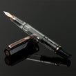TWSBI Eco Fountain Pen with translucent dark smoke grey grey cap and barrel end. Clear 'demonstrator' barrel reveals the filling mechanism, a built-in piston-filler with a very smooth action.Beautiful rose gold trim and pocket clip. TWSBI logo nicely finishes the top of the pen's cap. Rubber o-ring on cap thread ensures an airtight seal to prevent ink drying out in the pen, whilst also ensuring that the cap is firmly attached to the pen when not in use.