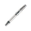 TWSBI Vac Mini Fountain Pen. Clear-barrelled vacuum-filling fountain pen. Transparent grip section and plunger cap. Chromed metal trim with matt metal pocket clip. TWSBI logo finishes the top of the cap nicely.
