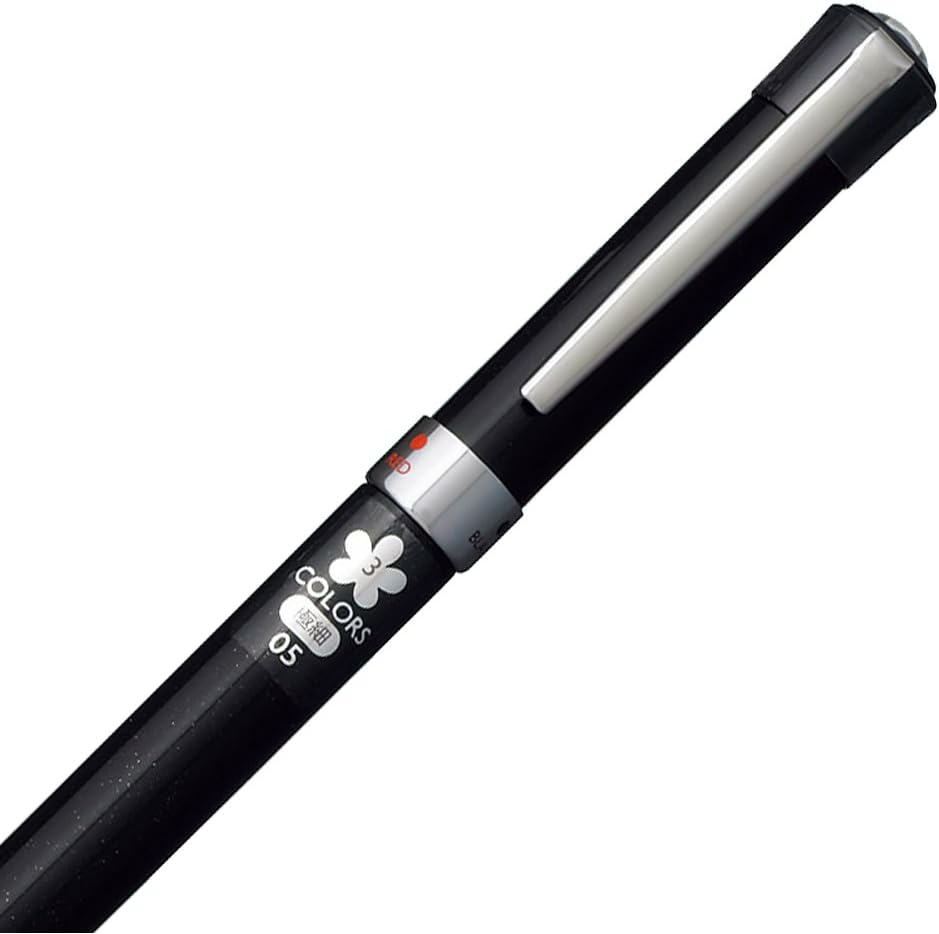 Multi-pen includes a black and red ink pen and a 0.5 mm pencil. The pen functions with a twist mechanism that allows you to rotate through all three instruments with a twist of the pen body.
