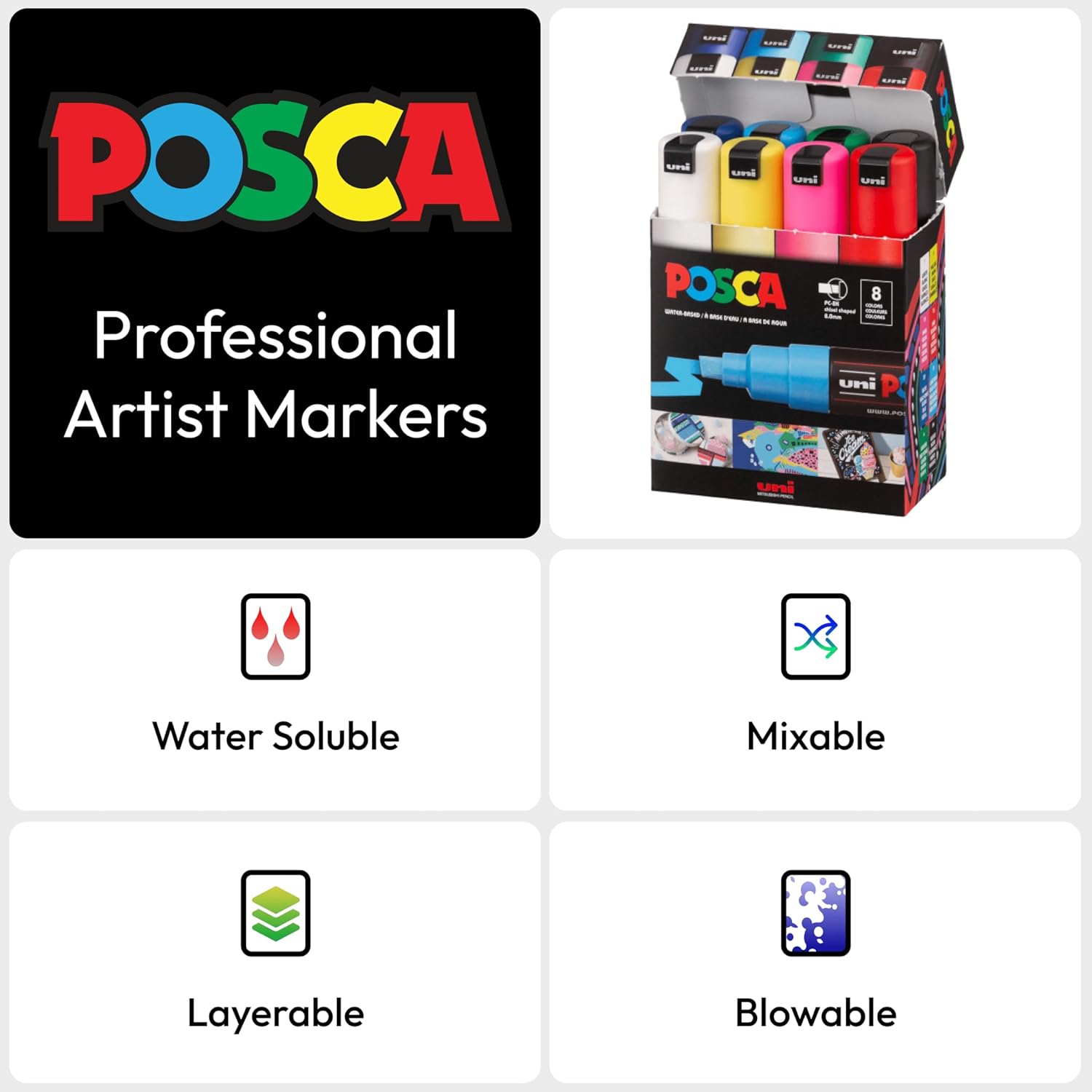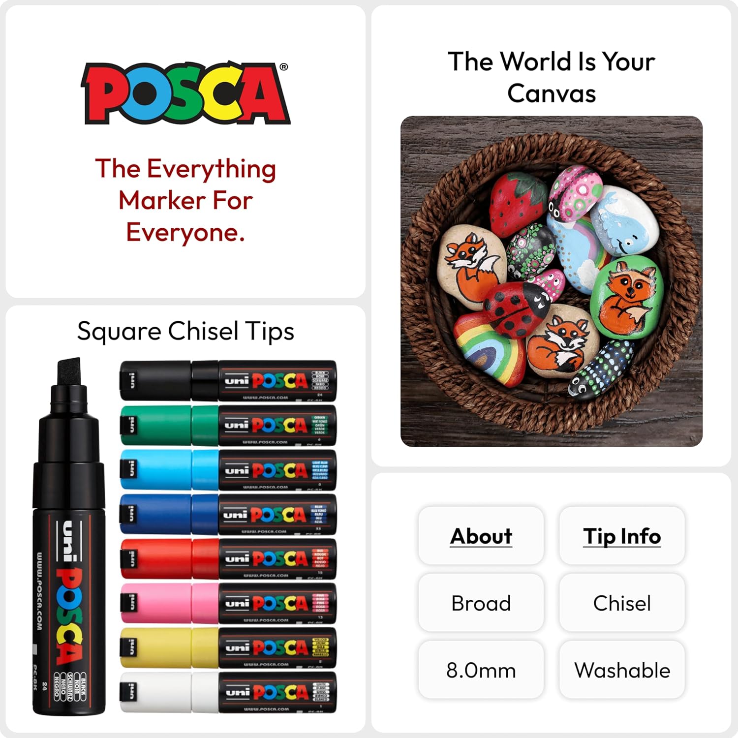 Uni Posca Paint Markers, PC-8K Broad Chisel Tips, Set of 8 Acrylic Art Pens for Coloring Fabric, Canvas, Glass, Wood, or Metal,