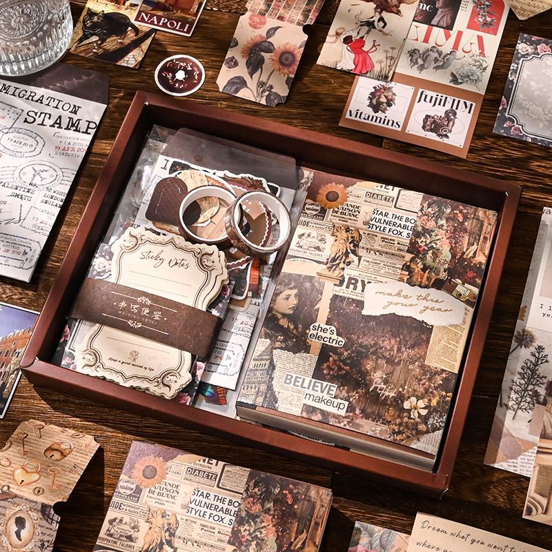 Transport yourself to a bygone era with our Vintage European Style A6 Notebook Set, a comprehensive DIY scrapbooking kit that serves as the perfect gift for women, girls, and stationery enthusiasts. This "Poem of the Century" themed collection is designed for those who appreciate the beauty of nostalgia, featuring a rich palette of sepia tones, classic florals, and antique typography.